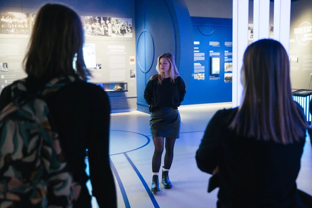 Экскурсию по новому медиа музею провела соосновательница бюро светового дизайна being.light и один из авторов проекта Алёна Осина. Алёна рассказала о нюансах работы света в пространстве и о том, как с его помощью раскрывается смысл экспозиции. Фото Марии Ростовской